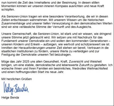 Brief des Landesvorsitzenden der Senioren-Union der CDU-NRW Helge Benda