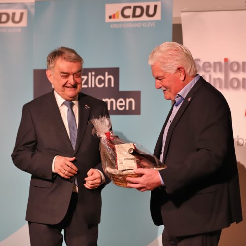 Minister Herbert Reul mit dem Vorsitzenden der Senioren Union Kreisverband Kleve Heinz van Baal Foto: Falk Neutzer Heinz van Baal, Vorsitzender der Senioren-Union (SU) im Kreis Kleve, hatte nach eigenen Angaben vier Jahre auf den Besuch von NRW-Innenminister Herbert Reul gewartet. Am Dienstagabend war es so weit: Der CDU-Politiker sprach vor 250 Parteikollegen im Haus am See im Gocher Ortsteil Kessel. Ein Heimspiel, immer wieder gab es tosenden Applaus für den obersten Dienstherren der Landespolizei. „Herbert Reul ist der wohl beliebteste Politiker im Land, ein Glücksfall für Nordrhein-Westfalen“, so van Baal. Der CDU-Landtagsabgeordnete Günther Bergmann dankte Reul dafür, dass es im Kreis Kleve wieder mehr Polizisten gebe. Er sagte: „Wir sehnen uns nach dem normalen Leben, nach einem auch für die Kinder und Enkel guten Leben. Herbert Reul steht für eine Konstante, die einen großen Teil dessen ausmacht: die Sicherheit.“