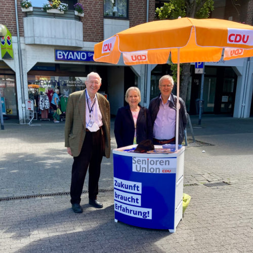 Am Freitag, den 08.07.2022 standen die Kreisvorsitzende Angelika Schürings, sowie die Vorstandsmitglieder Herbert Loock und Reiner Brandts, mit dem Canvassing Stand der Senioren-Union auf dem Eickener Marktplatz. Wir haben unser Versprechen eingelöst auch nach dem Wahlkampf die verschiedenen Stadtteile zu besuchen. Unser Stand war für die Bürger eine Überraschung und ist mit viel positiver Resonanz angenommen worden. Nicht nur die Senioren sprachen uns über Probleme in Eicken an, es gab auch Ideen und Anregungen, was man ändern oder verbessern könnte.