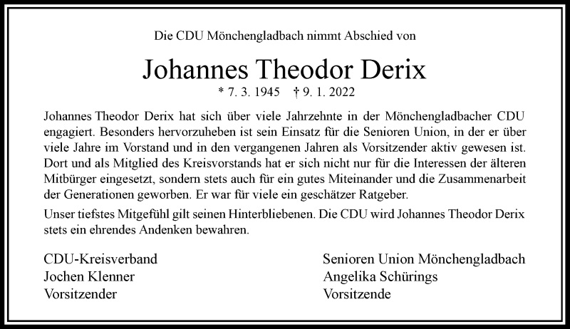 Der Vorstand des Bezirks der Senioren Union Niederrhein verabschiedet sich von ihrem ehemaligen Stellvertretenden Vorstandsmitglied Johannes Theodor. Wir werden Dich vermissen.